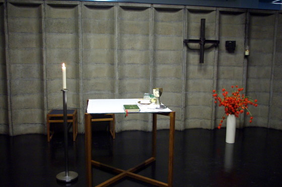 Bewusst wurden für den formal sehr reduzierten, quadratischen Raum alltägliche Industriematerialien verwendet. Den Fußboden aus Gussasphalt begrenzen Betontrogsteine, nach außen öffnet sich die Kapelle durch ein Lichtband aus Industrieglas in den Wohnbereich. Der Sakralraum wurd hier bewusst nicht als lebensferner Bereich, sondern als Raum mitten in der alltäglichen Lebenswelt gestaltet und erfahrbar gemacht. Ein Raum, der zwar vor allem zum persönlichen Gebet und frei gestalteten liturgischen Formen einlädt, aber nicht multifunktional-beliebig konzipiert ist. Durch Kreuz und Tabernakel vom Bildhauer Gerhard Moswitzer erhält er eine klare Ausrichtung und Definition. 2007 wurde der Raum vom österreichischen Künstler Leo Zogmayer neu gestaltet. In die gläserne Altarplatte hat er geometrisch aufgelöst alle Buchstaben des Alphabets gesetzt. Der Tisch des Brotes (der Eucharistie) ist in dem kleinen Kapellenraum zugleich auch Tisch des Wortes (des Evangeliums). Am Kapelleneingang hat der Künstler subtil eine Schwelle markiert: Ein ins Portal eingelassenes Zitat des Komponisten John Cage weist darauf hin, dass die eigene Disposition und Grundhaltung das geschehen in einem raum mitdefiniert: "If you celebrate it". Neben den Messfeiern am Donnerstag finden in der Kapelle das Taizegebet und andere frei gestaltete Gebetsformen und liturgische Feiern statt.