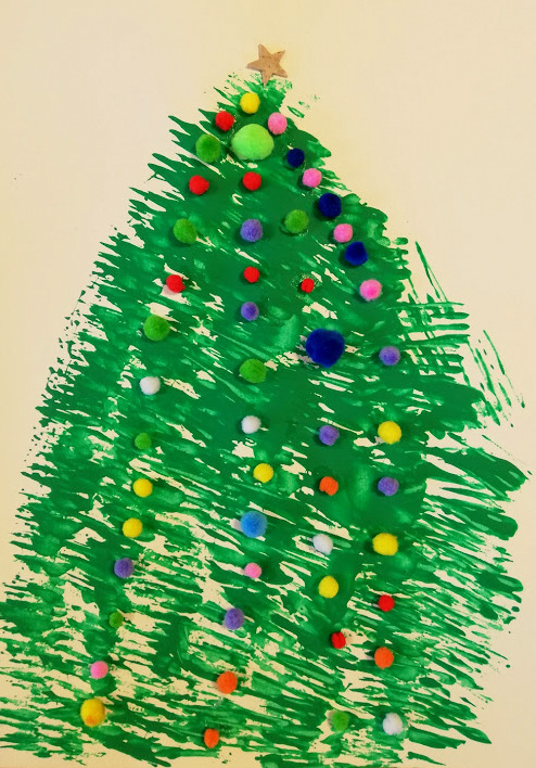 Danach wird das Blatt zum Trocknen gelegt. Daraufhin klebt ihr kleine Pompons auf das Bild. Zum Schluss wird ein Stern auf der Spitze des Baumes gezeichnet.