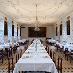 Gleichzeitig mit dem Jesuitenbibliothekssaal (heute Barocksaal) wurde das im ersten Stock des NW-Flügels befindliche Refektorium im barocken Sinne prunkvoller ausgestaltet. Schon das Holzportal weist auf den Innenseiten Doppelsäulen und aufwendige Schnitzereien sowie Einlegearbeiten auf. Zu beiden Seiten des langgestreckten Saales öffnen sich Fenster zum ehem. Universitätshof bzw. in den rückwärtigen Garten, die durch das hier höhere Niveau von außen gesehen ebenerdig liegen. Die Fensternischen sind mit großlappigen Akanthusstuck überzogen. An den Wänden zwischen den Fenstern hängen monumentale Gemälde mit Heiligendarstellungen, die kleinen Stuckkartuschen darüber zeigen Name und Wappen der ursprünglichen Spender. Wegen Baugebrechen musste die Decke im Jahre 1904 ausgewechselt werden. Der Raum hat dennoch seine barocke Repräsentanz bewahrt und dient glücklicherweise immer noch seiner ursprünglichen Funktion entsprechend - als Speisesaal.