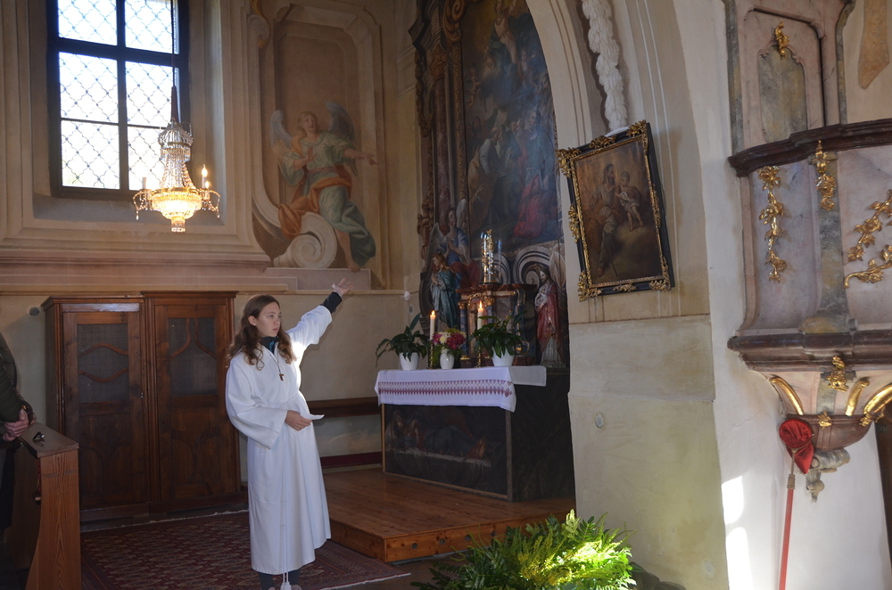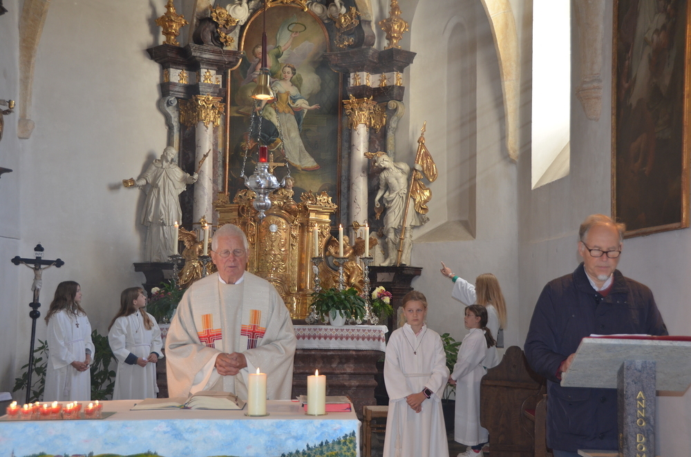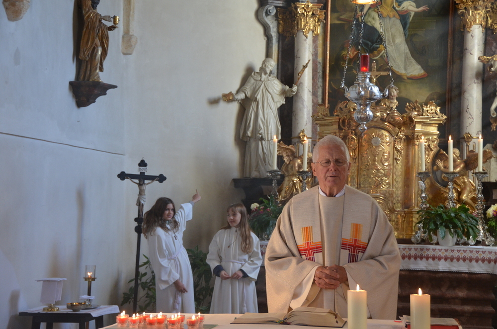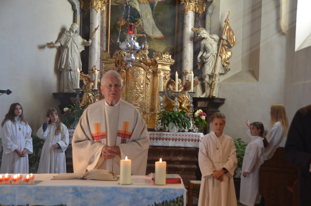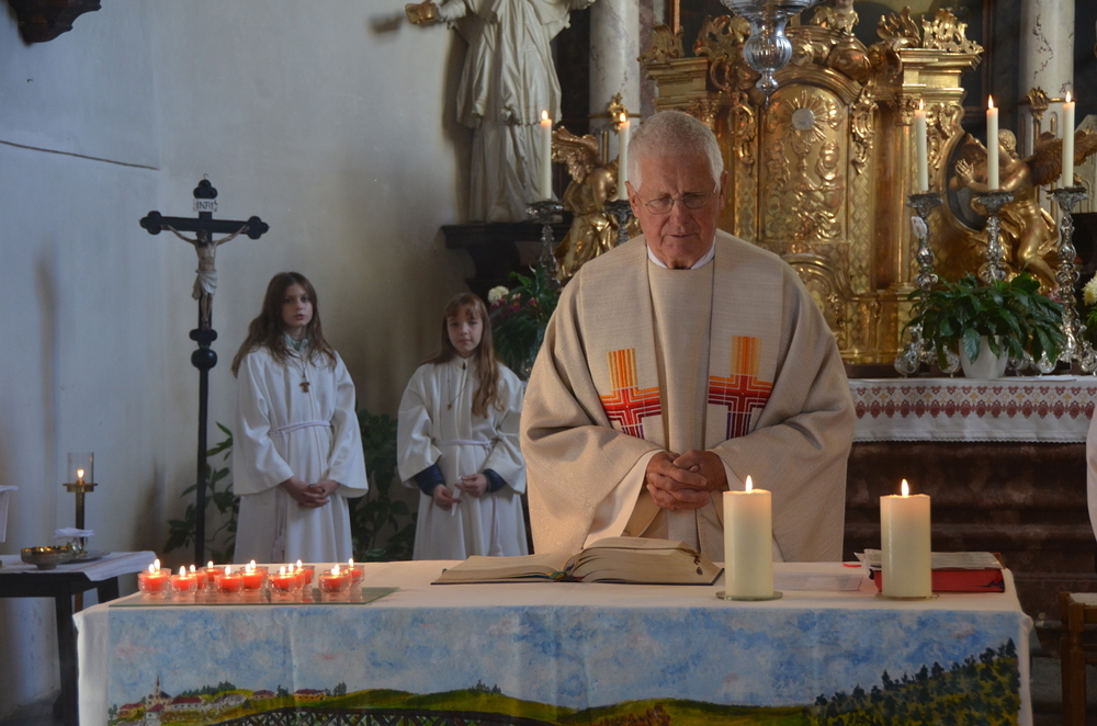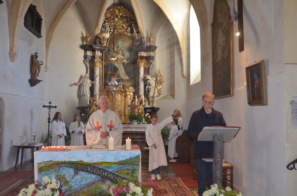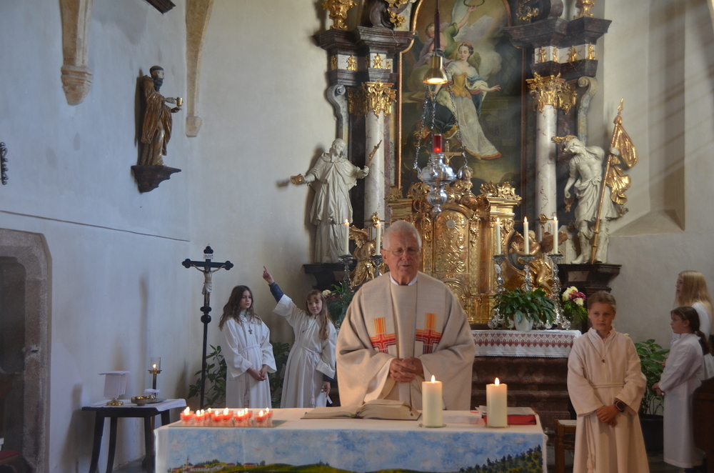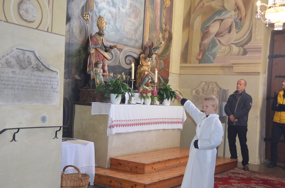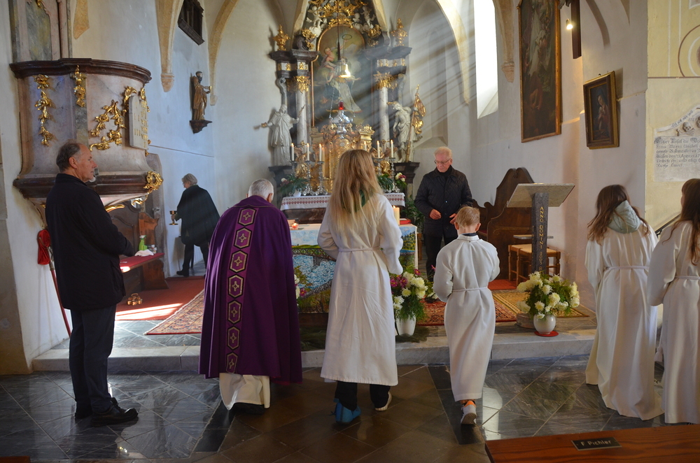Nach der Predigt wurden die Heiligen, die in der Peggauer Kirche dargestellt sind, angerufen, wobei die Ministranten auf die Heiligenfiguren zeigten.