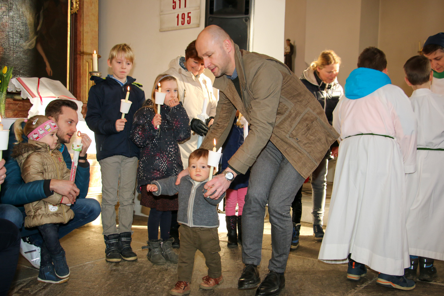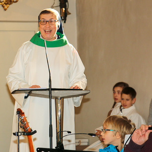 Drei Mütter sprachen bei der Predigt über die Themen aus dem Evangelium (Salz und Licht) und der Taufe. Bei der Taufe stehen drei Symbole im Mittelpunkt: Das Taufwasser, das weiße Kleid und die Taufkerze. Diese Taufkerze brachten die Kinder mit, um sie an der Osterkerze zu entzünden und so an ihre Taufe erinnert zu werden.