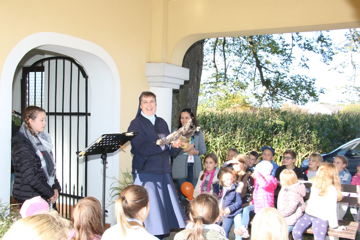 Sr. Maria wird bei ihrer Predigt zum Advent von den Kindern unterstützt.