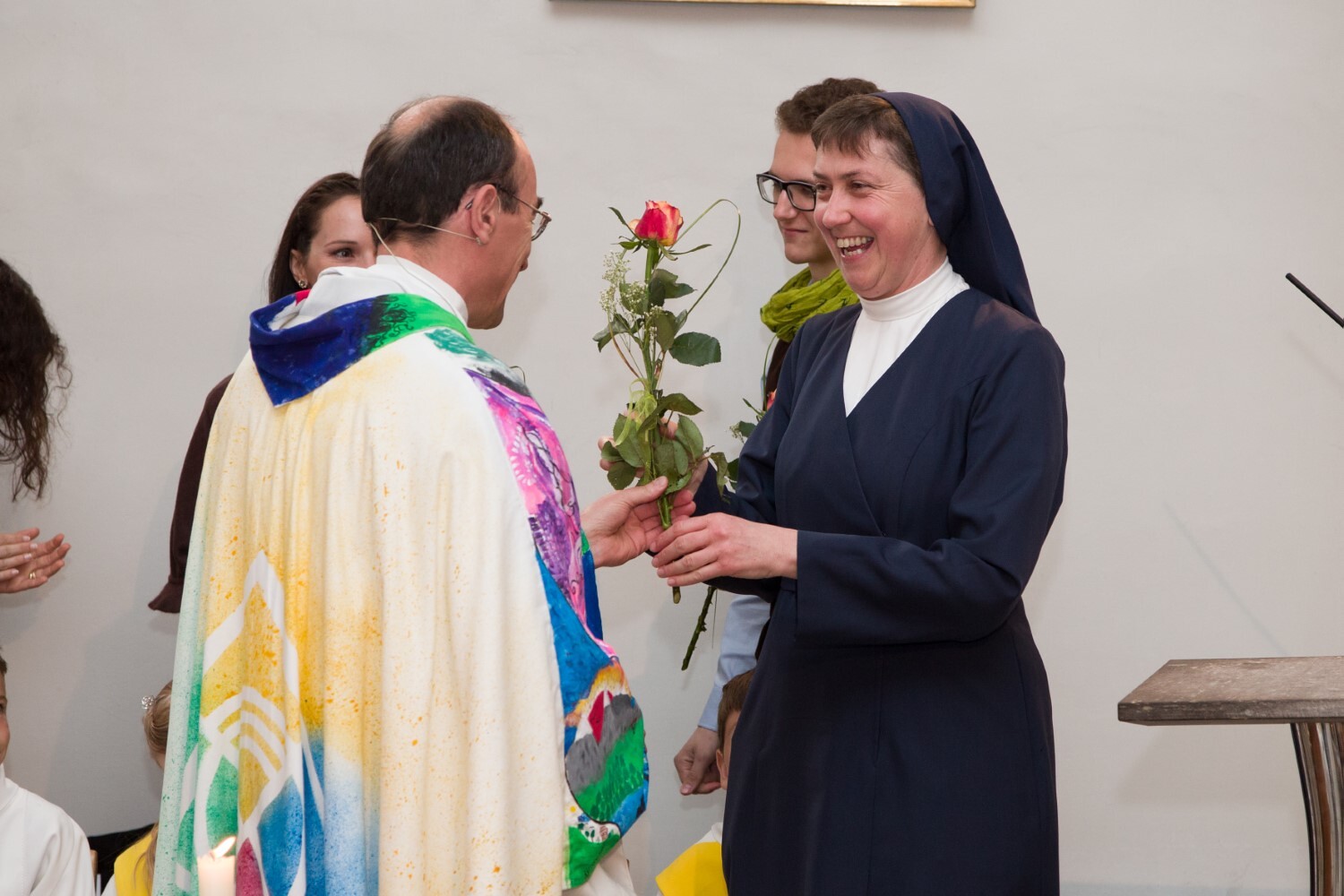 Pfarrer Johann Karner überreicht Sr. Maria das Dekret zur Wort-Gottes-Feier-Leiterin. Sie trägt erstmals eine weiße Albe.