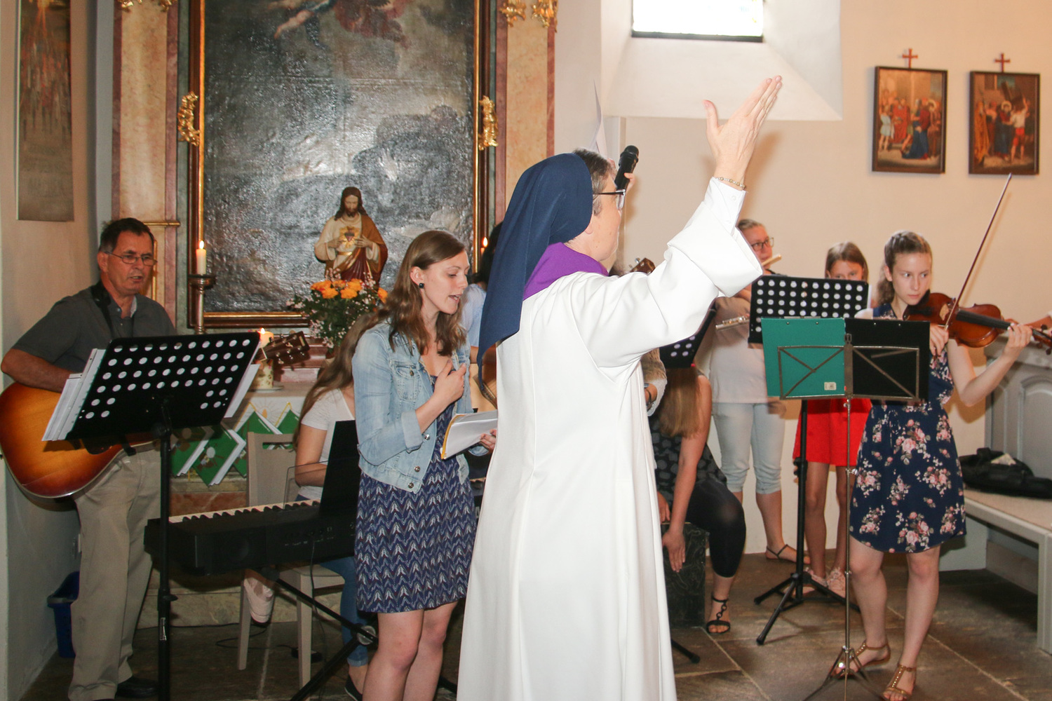 Und auch Sr. Maria beginnt einen neuen Dienst: Sie wurde nach einer Ausbildung vom Bischof als Begräbnisleiterin in die Pfarre gesendet und bekam von Pfarrer Hans Karner das Dekret dafür im heutigen Gottesdienst überreicht. Dabei trug sie eine weiße Albe mit einem violetten Kragen, wie es für Begräbnisleiterinnen vorgesehen ist.