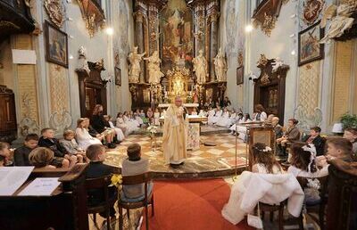 Im Rahmen der Vorbereitung wurde neben den drei gemeinsam gestalteten Familiengottesdiensten zudem eine Kirchenführung mit vier Stationen angeboten, bei der die Kinder ihre Pfarrkirche ganz neu entdecken durften. Der Altarraum, die Sakristei, der Klostergarten und die Spiele im Pfarrsaal wurden erkundet – verbunden mit vielen spannenden Informationen über Symbole und liturgische Gegenstände.
