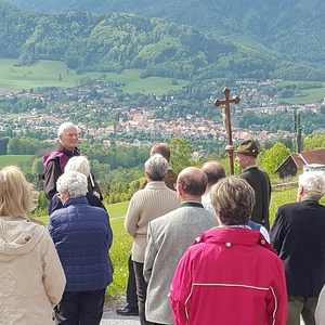 Bei schönem Wetter und toller Aussicht auf Frohnleiten wanderten zahlreiche Personen mit. Pater Simon gestaltete diese Feldersegnung mit Unterstützung der Dirnbergbauern.