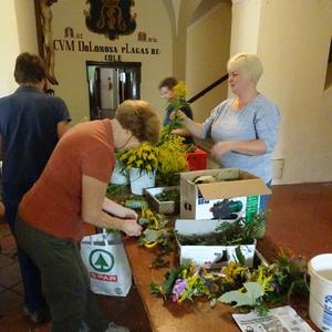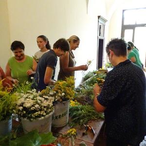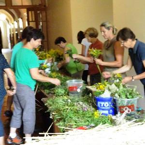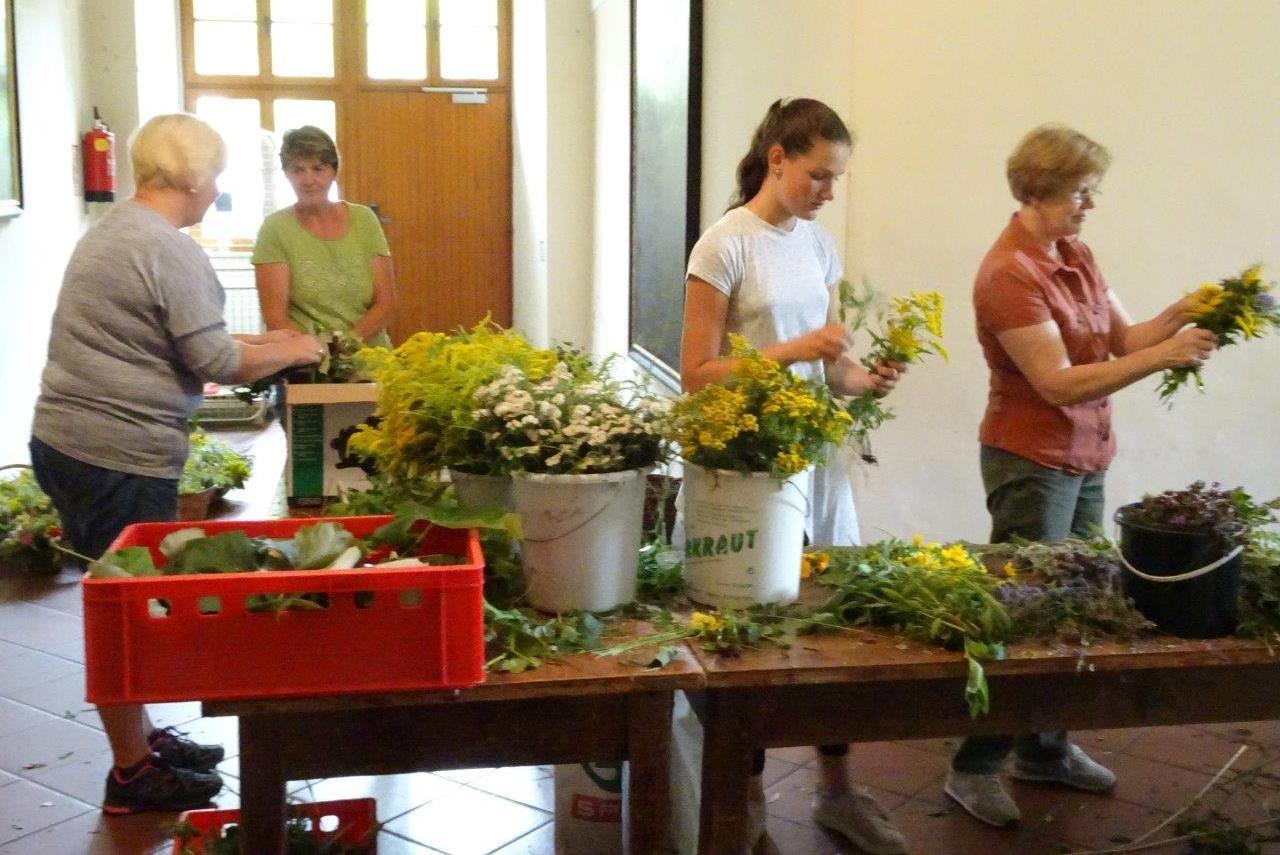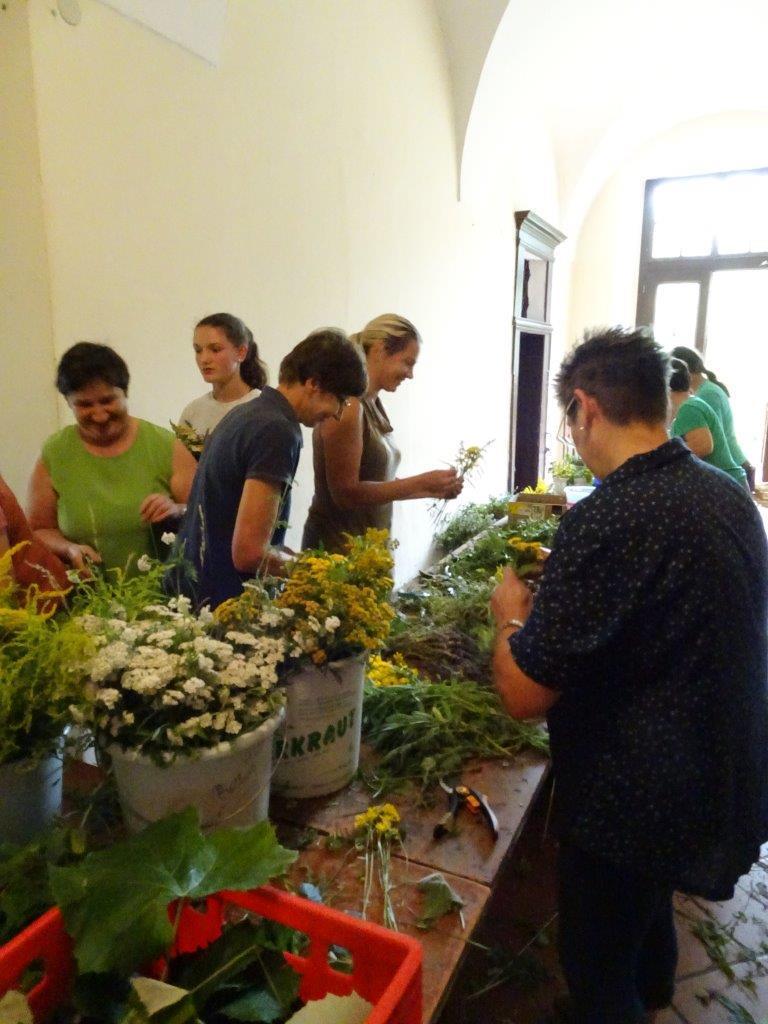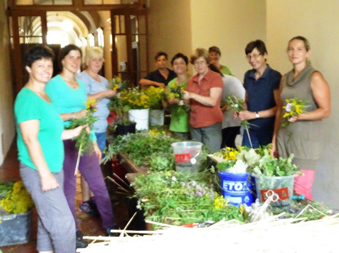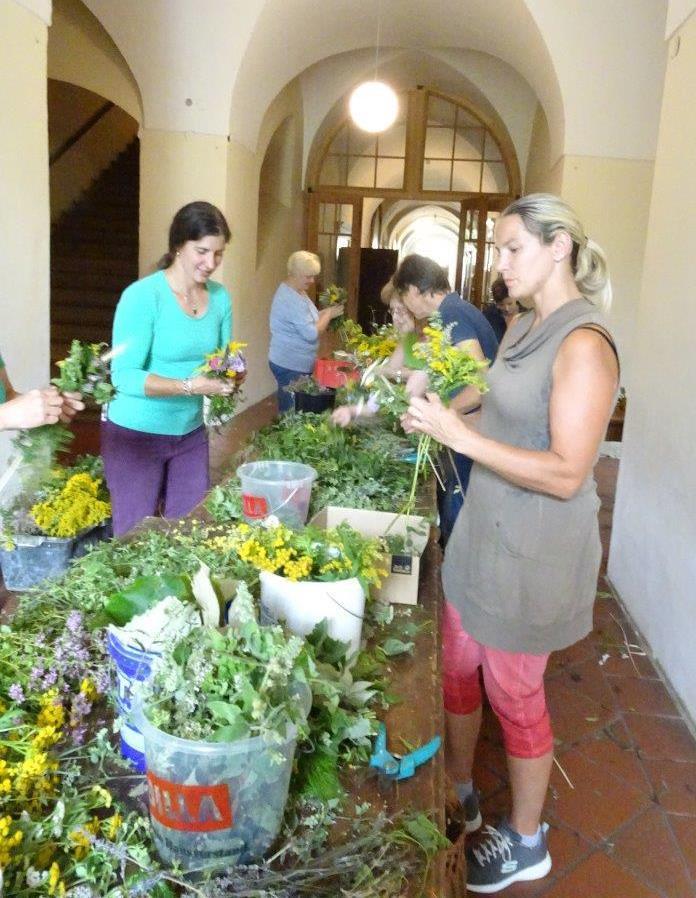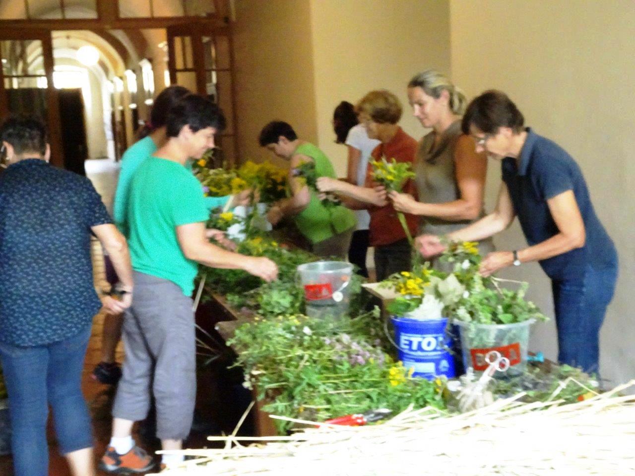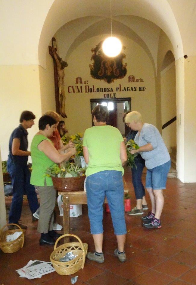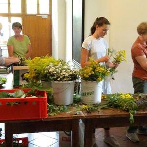 Kräuterbüschelbinden im Klostergang am 14. August 2018