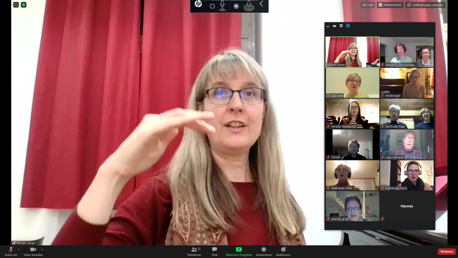 Um den Kontakt nicht ganz zu verlieren, trafen wir uns als Ersatz zu Online-Chorproben in Form von Videokonferenzen. Zwar ist das gleichzeitige Singen wegen der verschiedenen Übertragungsgeschwindigkeiten des Internets nicht möglich, aber mittels Vor- und Nachsingen kann man doch recht gut alte Stücke wiederholen oder auch einfache neue Lieder einstudieren. Besonders während der Adventzeit konnten wir auf diesem Weg sehr stimmungsvoll miteinander singen!