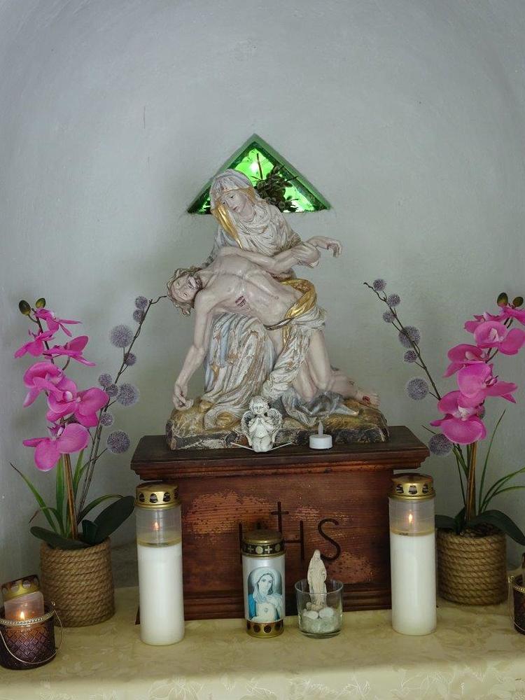 Herzstück war in der Mitte eine fast ein Meter hohe Pieta aus Gips. Im Jahre 1945 machten die Soldaten der russischen Besatzungsarmee am naheliegenden Hof Station. Fast jeden Tag kamen einige gläubige Russen zu diesem Bildstock und verrichteten dort laut betend ihre Andacht.