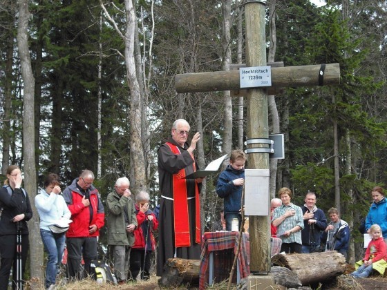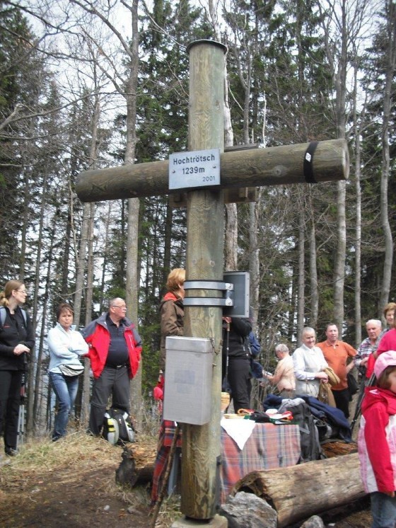 Ein Kreuz auf dem Gipfel eines Berges dient nicht nur als Markierung der höchsten Stelle, sondern auch als religiöses Zeichen des Glaubens. Am 22. April 2001, einem sogenannten „Klein-Ostersonntag“ oder auch „Weißen Sonntag“, konnte Franz Waidacher sein wohlüberlegtes und Gott dargebrachtes Versprechen einlösen, wobei ihn Verwandte und Nachbarn unterstützten. Schon am Vortag hatte der Genesene ein Loch in den schneebedeckten, steinigen Boden des Gipfels in Schönegg gegraben. Auf seinem Hof betonierte er einen Sockel, Schwiegervater Johann Barth brachte die erforderlichen Eisenteile in Form und Nachbar Josef Friedam besorgte die wetterbeständigen Rundhölzer bei der Firma Mohik Wertholz in Schrauding. Alle Teile wurden daraufhin mit dem Schlitten auf den Hochtrötsch transportiert, um das Kreuz mit einer Höhe von 2,50 m und einer Breite von 1,80 m im Einvernehmen mit der Alpenvereinssektion Frohnleiten zusammenzubauen. Der bereits vorhandene Behälter für das Gipfelbuch und ein Schild wurden am Kreuz befestigt. Der begeisterte Bergwanderer Felix Köhldorfer (+ 22. Dezember 2011) stellte später noch ein Ruhebankerl auf diesem idyllischen Platz zur Verfügung. Es ermöglicht eine klassische Gipfelrast mit einem wunderbaren Blick, der zum Nachdenken einlädt. In unmittelbarer Nähe steht am Wanderweg 750 noch das Rüsterkreuz, am Niedertrötsch das Friedenskreuz und am Fuße des Berges ein Leonhard-Bildstock.