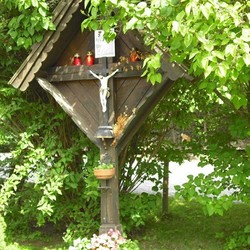Dieses wunderbare Holzkreuz mit der Christusfigur steht zwischen dem Wohnhaus von Johann Fuchsbichler vlg. Hansbauer und Stall im Hofbereich, umgeben von schönen Flieder-, Jasmin- und Wacholdersträuchen.