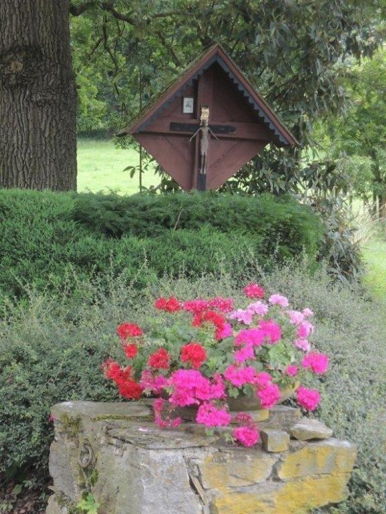 Das Wegkreuz ist auf einem stabilen Betonsockel befestigt. Davor ist ein kugelförmiger Eibe-Wacholder-Strauch gepflanzt, der von Bediensteten des Forstgartens gepflegt wird. Seitlich steht noch ein wolliger Schneeball, ein kräftiger, sommergrüner und weißblühender Strauch.