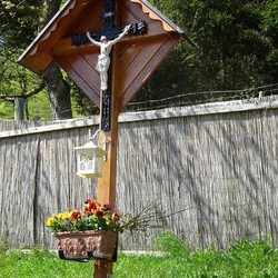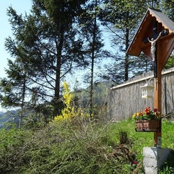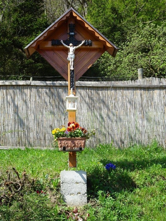 Unter dem Kruzifix sind eine weiße Laterne und ein Blumenkisterl angebracht. Ein Betonfundament sorgt für einen sicheren Standort. Sohn Patrik Neuherz, ein gelernter Spengler, stattete dieses Wegkreuz kunstvoll mit einem Kupferdach aus. Zwischen den gepflanzten Sträuchern ist auch ein Zugang möglich.
