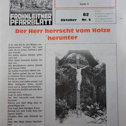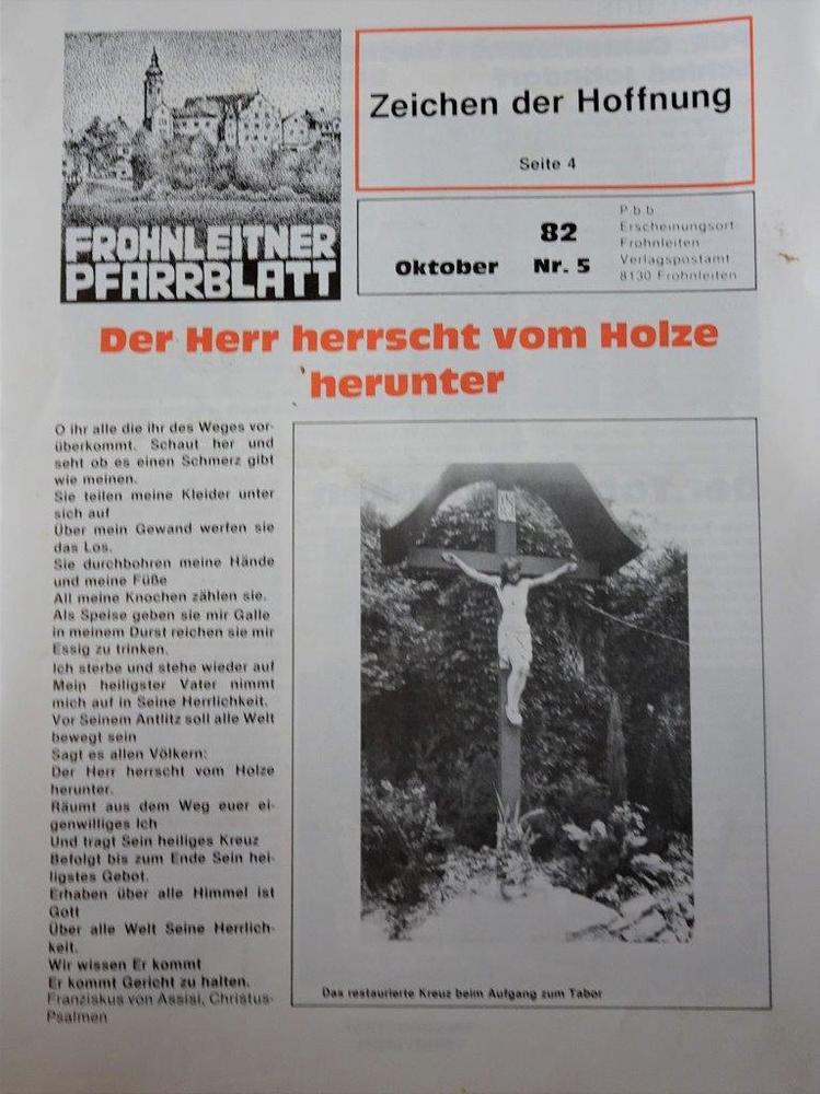 Die letzte Restaurierung erfolgte 1982. Aus diesem Anlass erschien auf der Titelseite des Frohnleitner Pfarrblattes vom Oktober 1982 ein Foto des Kreuzes mit der Überschrift des Christus-Psalms „Der Herr herrscht vom Holze herunter“:
