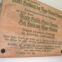 Die ehrwürdige Kapelle im Bereich der Forstdirektion Mayr-Melnhof Frohnleiten wurde im Jahre 1998 von den dankbaren Mitgliedern der Zweigstelle Frohnleiten des Steirischen Jagdschutzvereins (JSV) unter dessen Obmann Ing. Hubert Platzer errichtet. Gewidmet wurde sie dem frommen Gedenken an Franz Freiherrn von Mayr-Melnhof-Saurau (1949-1993) und dessen Mutter Marie Gräfin Goess-Saurau (1921-1996), Trägerin des goldenen Ehrenringes der Steirischen Landesjägerschaft. Ihrer beider Streben und Wirken galt der Erhaltung von Wald, Wild und Natur. Die Pflege der guten steirischen Jagdtradition war ihnen ein ganz besonderes Anliegen. Daran erinnert heute eine seitlich im Innenraum angebrachte und wunderschön gestaltete Gedenktafel.