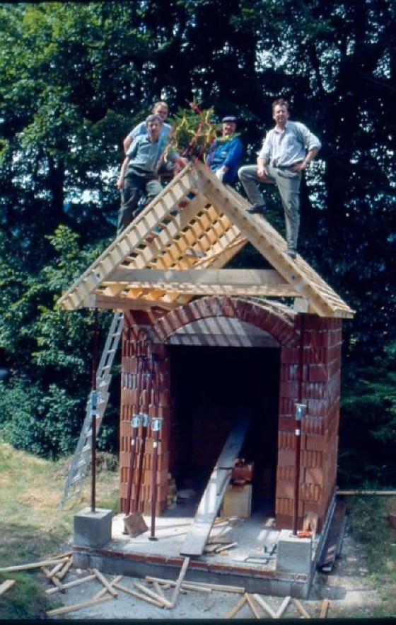 Mit Vermessungsarbeiten vor dem Haus Mayr-Melnhof Straße 8 begann am 14. März 1997 der Bau der Kapelle. Durch viel Idealismus und Eigenleistung konnte der JSV diese schöne Gedenkkapelle in nicht einmal zwei Jahren errichten. Sie steht auf einem Streifenfundament aus Beton und wurde aus Betonziegeln und gelochten Mauerziegeln gebaut, auf denen eine hölzerne Dachkonstruktion ruht. Das Vordach wird von zwei Lärchensäulen getragen, die Zimmermeister Josef Konrad jun. kunstvoll gestaltete. Die 850 Biber-Dachziegel und die 15 Firstziegel wurden von den Vereinsmitgliedern mühevoll bei einem abbruchreifen Nebengebäude in Schloss Weyer abgetragen und beim Kapellenneubau gereinigt wieder verwendet. Vor dem Eingang, der mit einer Tür aus Schmiedeeisen verschlossen ist, wurde ein Vorplatz mit 12 m² Steinplatten ausgelegt. In der zentralen Mauernische der Kapelle befindet sich ein Gemälde der Grazer Künstlerin Christin Berlin. Sie verwendete dazu ein Foto des obersteirischen Reitinggebirges, dessen 2.215 Meter hoher Gößeckgipfel den höchsten Punkt im gesamten Forstbetrieb Mayr-Melnhof-Saurau darstellt. Dieses Foto wurde auf eine Overheadfolie übertragen und mit einem Projektor an die Kapellenwand projiziert, um der Malerin die naturgetreue Darstellung des Gebirgszugs zu erleichtern.