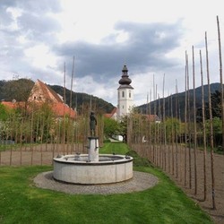 Eines der älteren Bilder unseres Klostergartens ist ein Gemälde im Servitenkloster zu Innsbruck, das die Filiale „Conventum divae V. Assumptae Fronleithi in Styria“, unser Kloster zeigt. Unser Wirtschaftsratsobmann Franz Koiner hat uns Fotos davon gemacht. Leider ist das Bild nicht datiert, das Vorhandensein des Dachreiters schränkt es aber zwischen 1683 (Fertigstellung des Turmes) und 1763 (Brand, nach dem er nicht mehr aufgebaut wurde) ein. Im Hintergrund sieht man die Gartenanlage, wie sie- leicht idealisiert- einem Barockgarten entspricht. Geometrisch angelegte Wege, das Lusthaus im Hintergrund und interessanterweise ein Obstgarten dort, wo jetzt alljährlich das Erntedankfest stattfindet. Wenn man in letzterem Bereich im Boden gräbt, findet man Unmengen von Ziegelschutt, der sicher sekundär dort abgelagert wurde, möglicherweise nach den verheerenden Bränden, die Frohnleiten mehrmals heimgesucht hatten. Ein paar Dinge fallen noch auf: Die Mauer, die den ganzen Garten umgab, später jedoch (siehe Franziszeischer Kataster 1820-1825) nur mehr den Gemüsegarten und das Glashaus in seiner jetzigen Form einschloss. Weiters ist kein Brunnen eingezeichnet, was recht ungewöhnlich ist für eine Zeit, in der Wasserleitungen zur Versorgung noch nicht existierten.