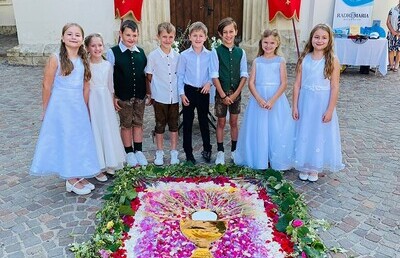 An Fronleichnam feiert die katholische Kirche, dass Jesus in geweihtem Brot und Wein auch nach seinem Tod gegenwärtig ist. Vielerorts finden Prozessionen statt, Kinder streuen dabei Blüten auf dem Weg und an den Feldstationen werden wunderschöne Blütenbilder vorbereitet. So auch bei uns in Gamlitz...