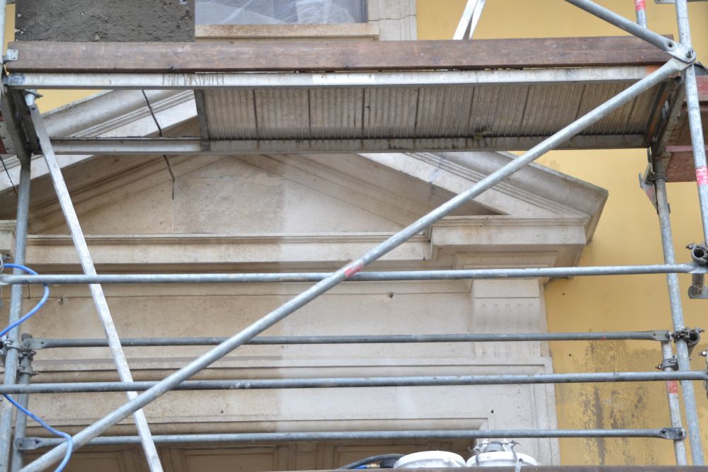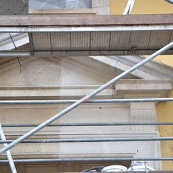 Gleichzeitig arbeiteten die Steinrestauratoren an den Fenster- und Türumrandungen und dem Sockel.