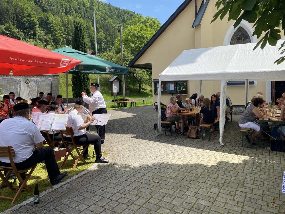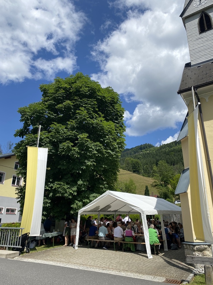 Pater Thomas feierte mit uns das Hochamt um 10:30 Uhr. Geige, Orgel und Trompeten brachten uns in feierliche Stimmung. Nach dem Gottesdienst spielte die Bergknappenkapelle Unterlaussa. Es gab alles von Schnitzel bis Schilcher Charmant.